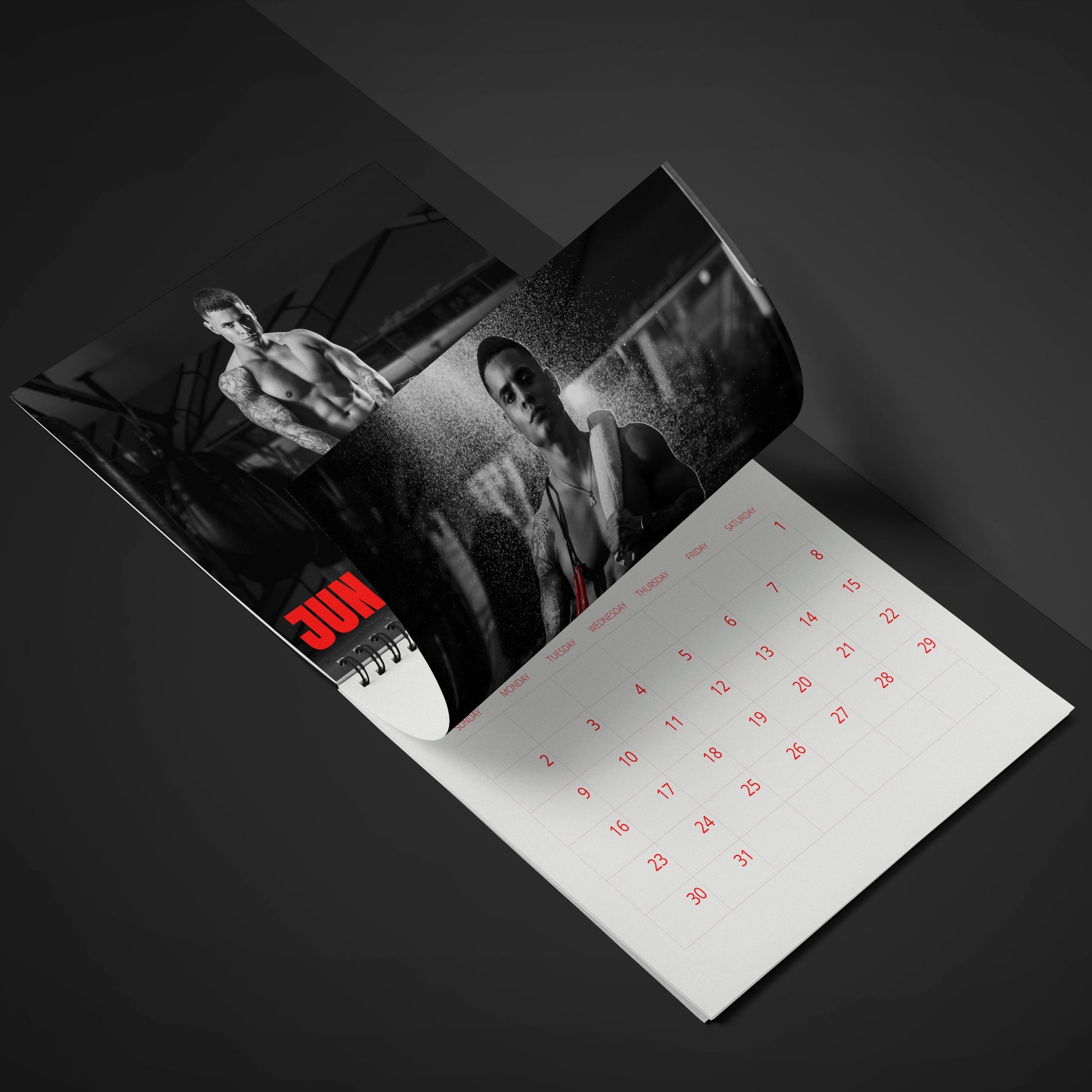 Each month features an exclusive black-and-white photograph with striking red accents, showcasing Christian in moments of training, reflection, and movement — balancing fitness and seduction.